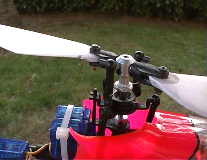 The sheer ease of the whole operation was added to by the fact that the balls on the blade holder pitch arms are a good fit in the standard 'Hornet' ball links. Thus, I was able to use the existing links. It was necessary to use trailing edge control in order to give some 'Delta 3' effect.