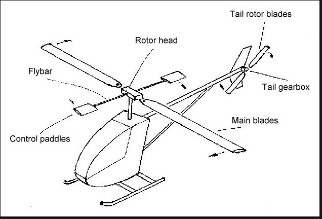 Except in the case of specialised scale models, model helicopters usually employ main and tail rotors having two blades. The main rotor will have a stabiliser bar (flybar) at right angles to the main rotor with control paddles mounted at each end. This is the type of model which should be used for learning to fly; the newcomer has more than enough problems to contend with without making matters worse by trying to cope with an unnecessarily complicated model.